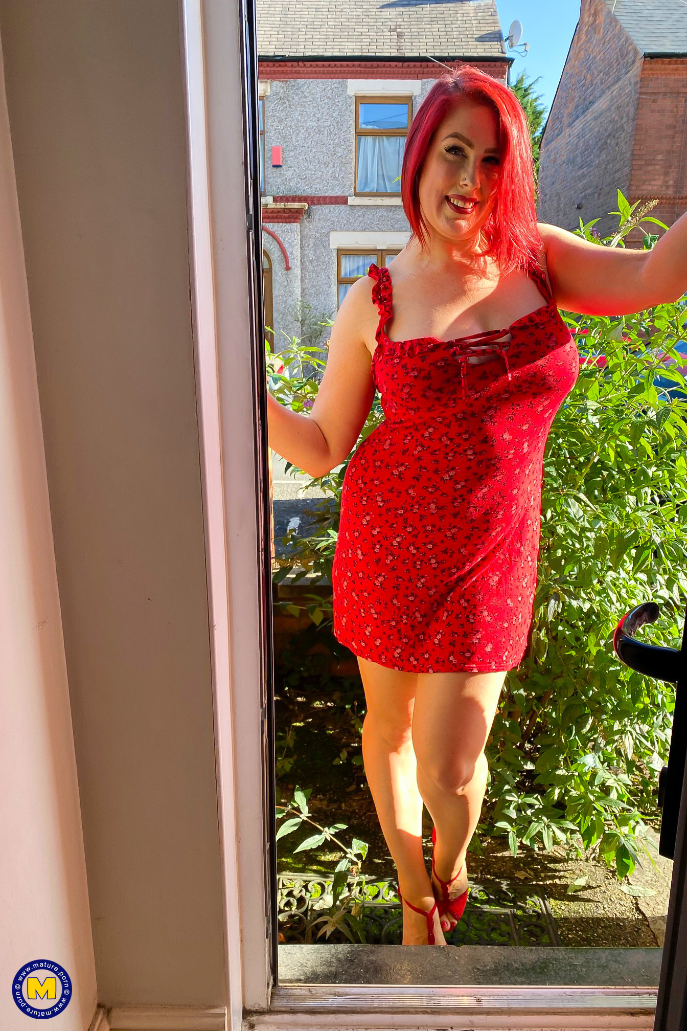 Curvy redhead gilf in heels plays with her tits and hairy pussy