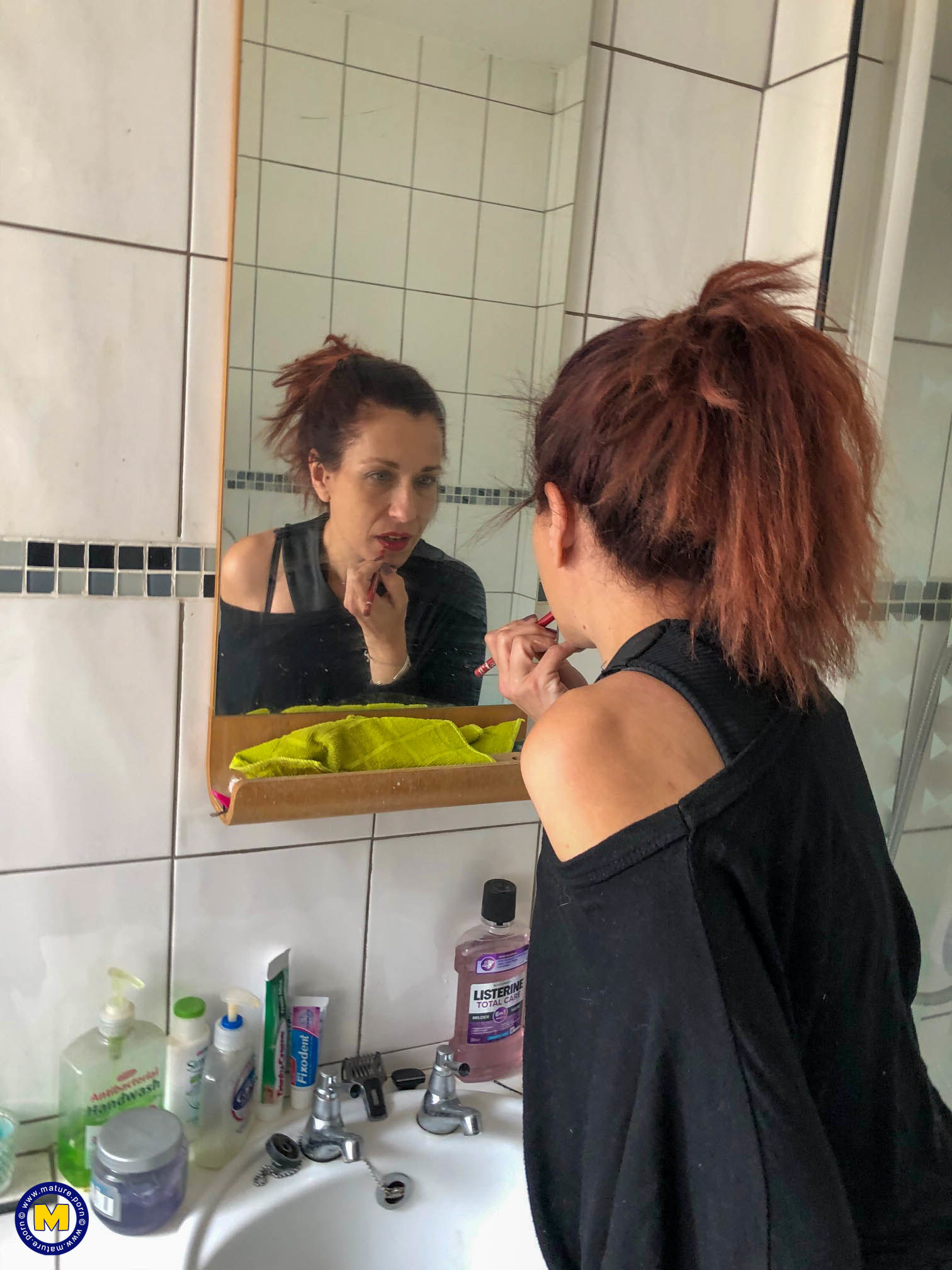 Curvy redhead gilf in heels plays with her tits and hairy pussy
