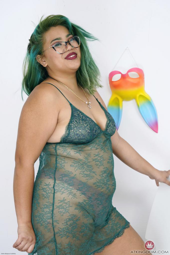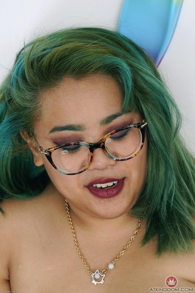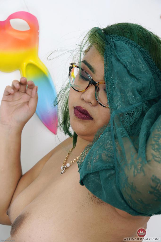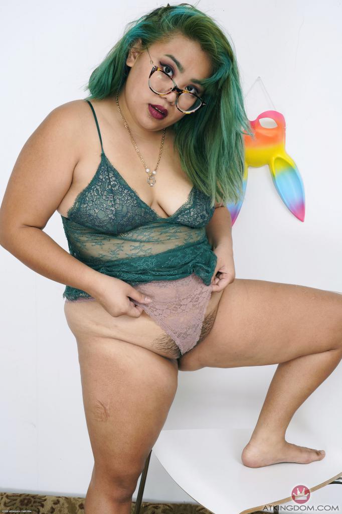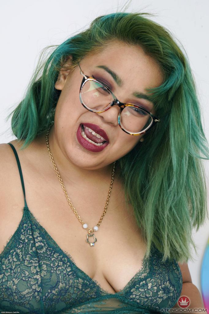 Green-haired Asian MILF with lovely face poses fully nude near wall