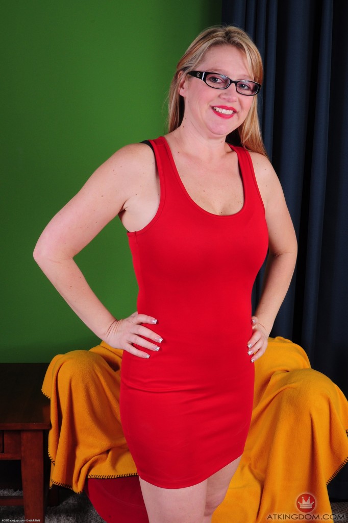 Horny blonde wife in glasses is undressing her large ass and making that pussy feel very fine