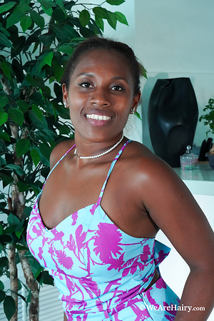 Horny ebony cozied up on a high chair with black hairy pussy