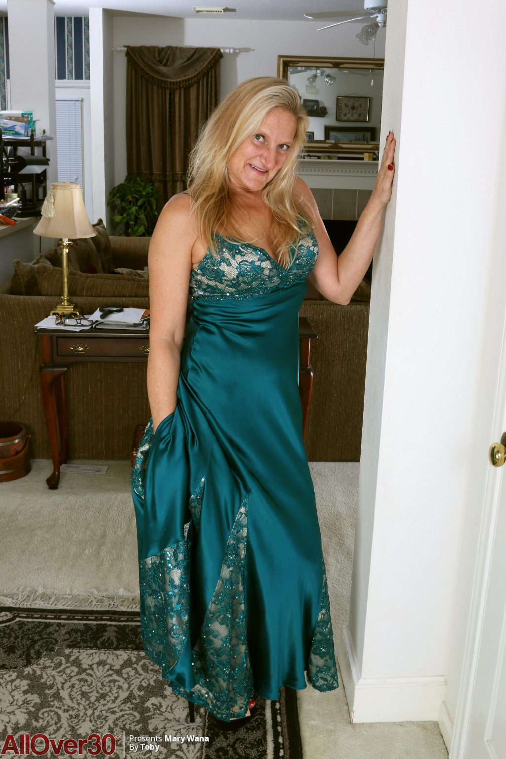 Blonde mom in lingerie teases her mature pussy
