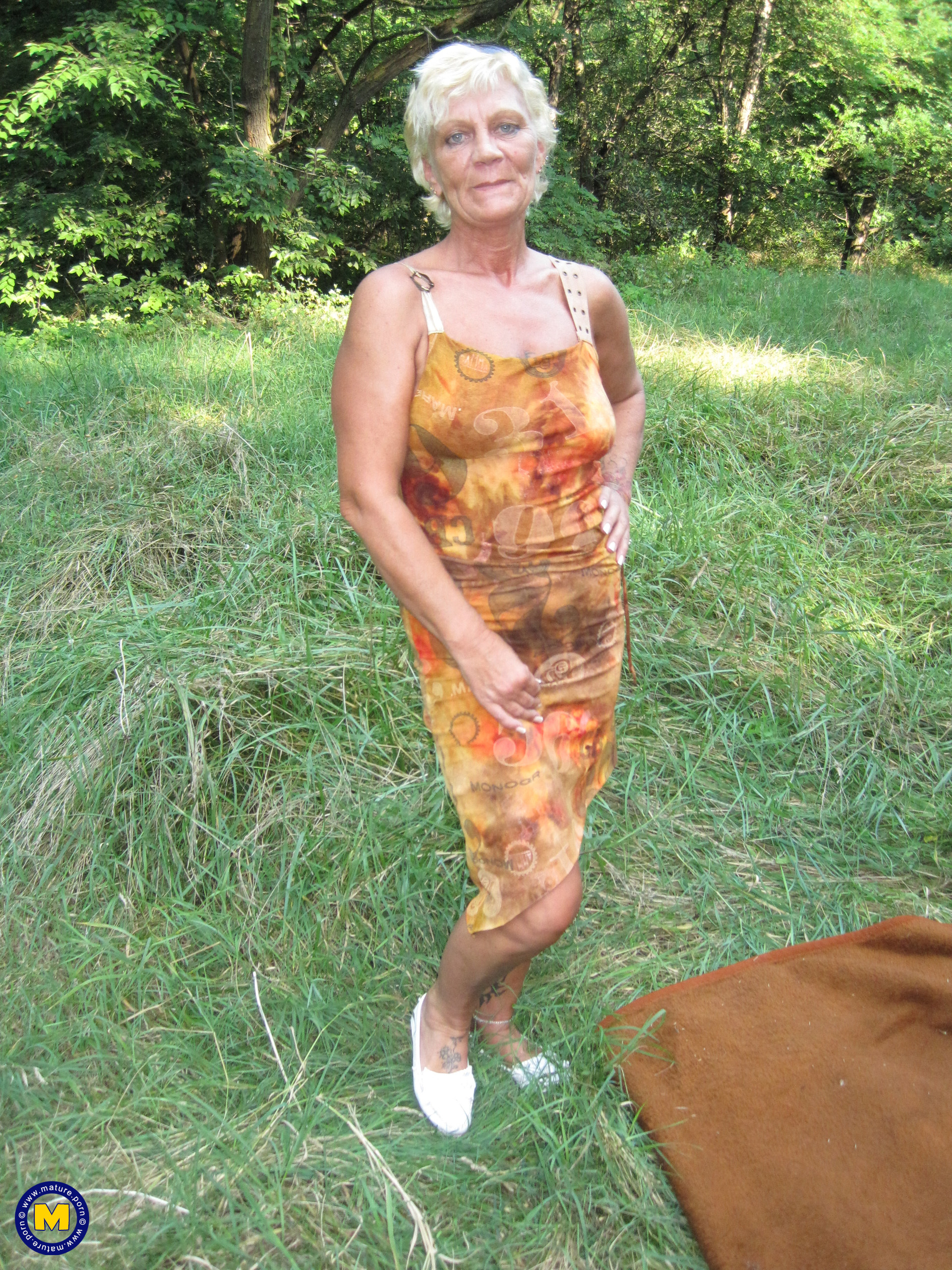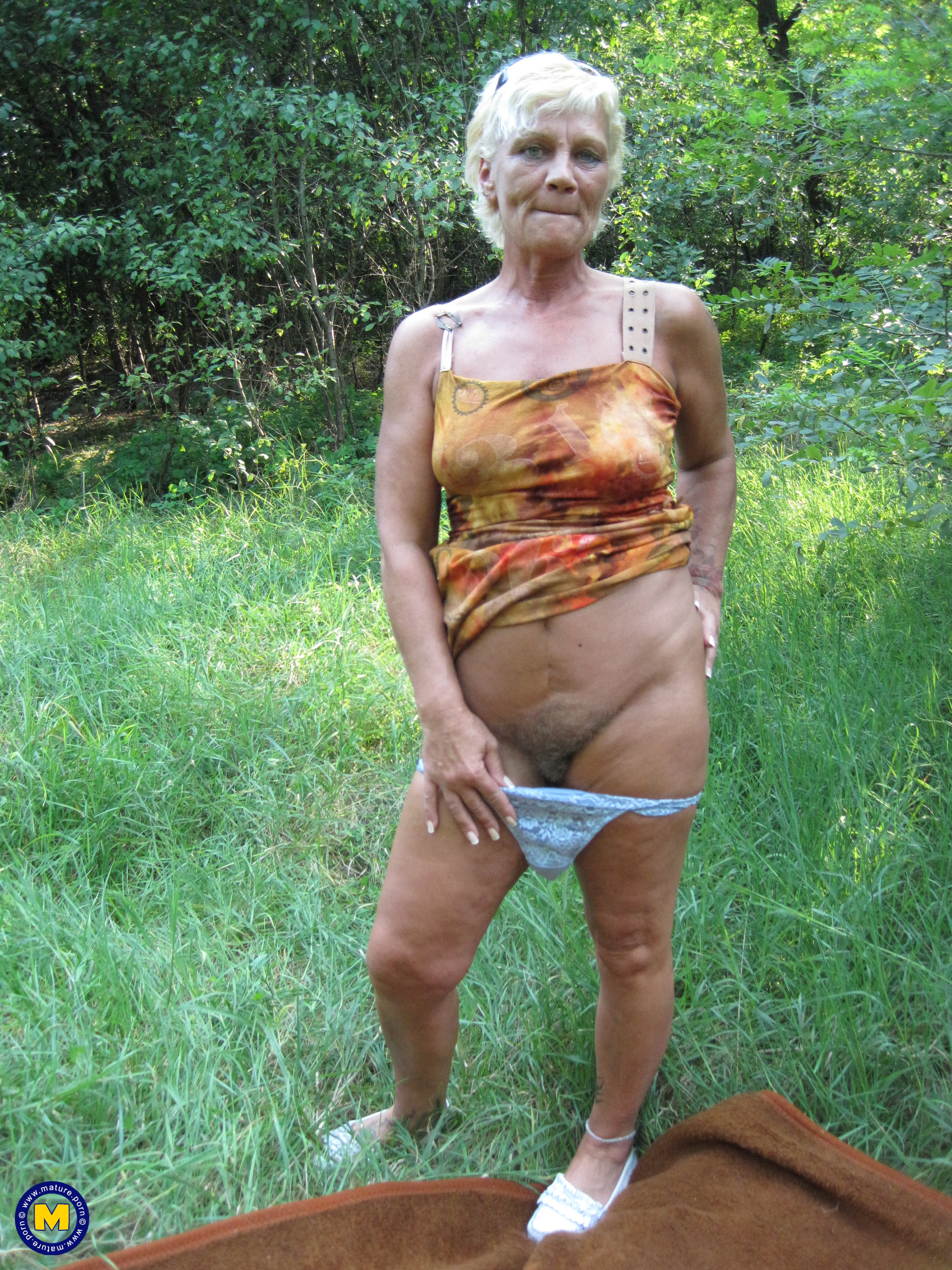 Outdoor pics of mature slut with saggy tits who flashes her assets