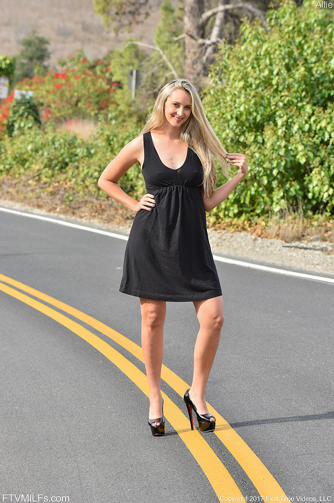 Porn pics of blonde girl flashing slender body on the road
