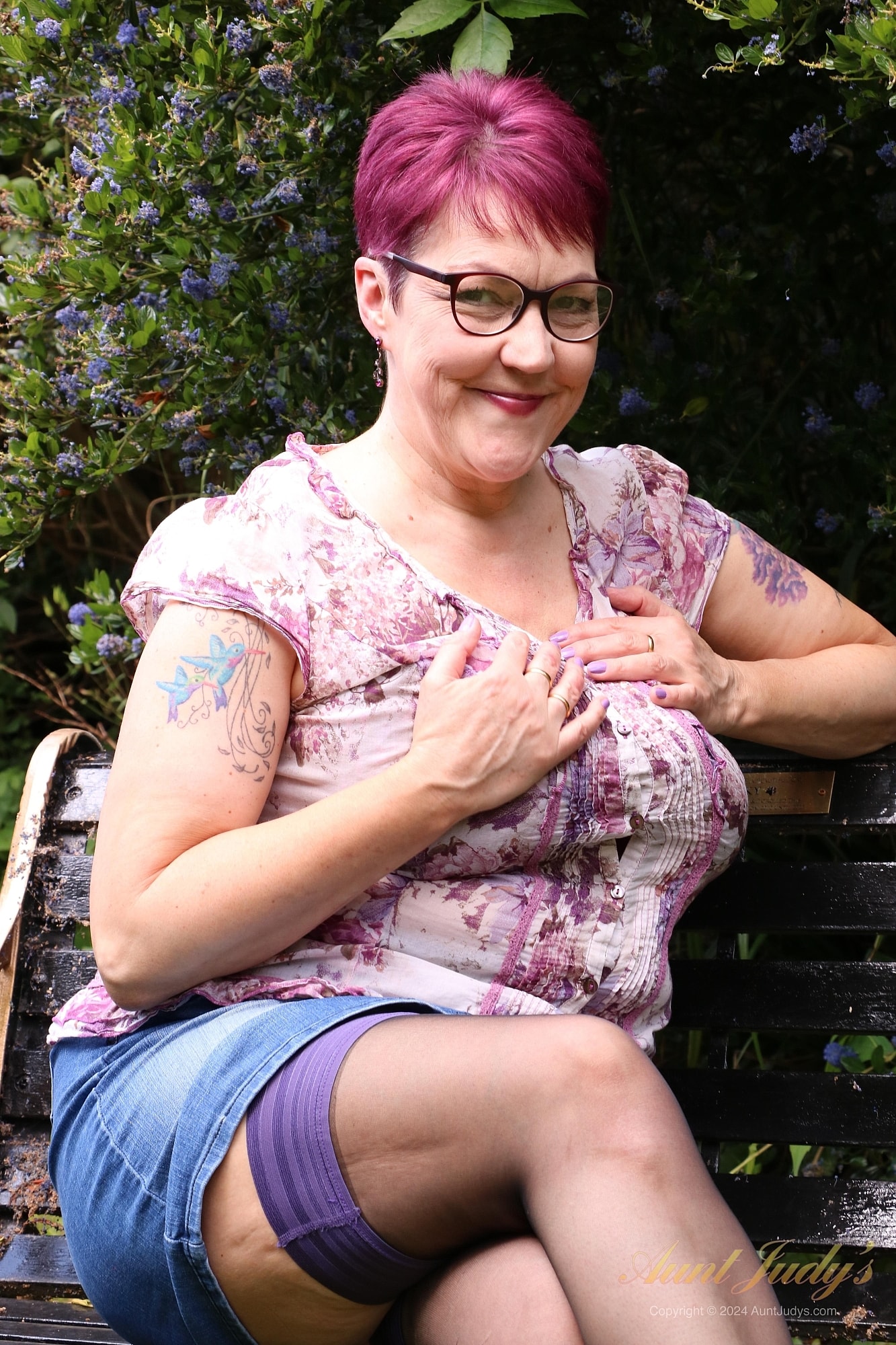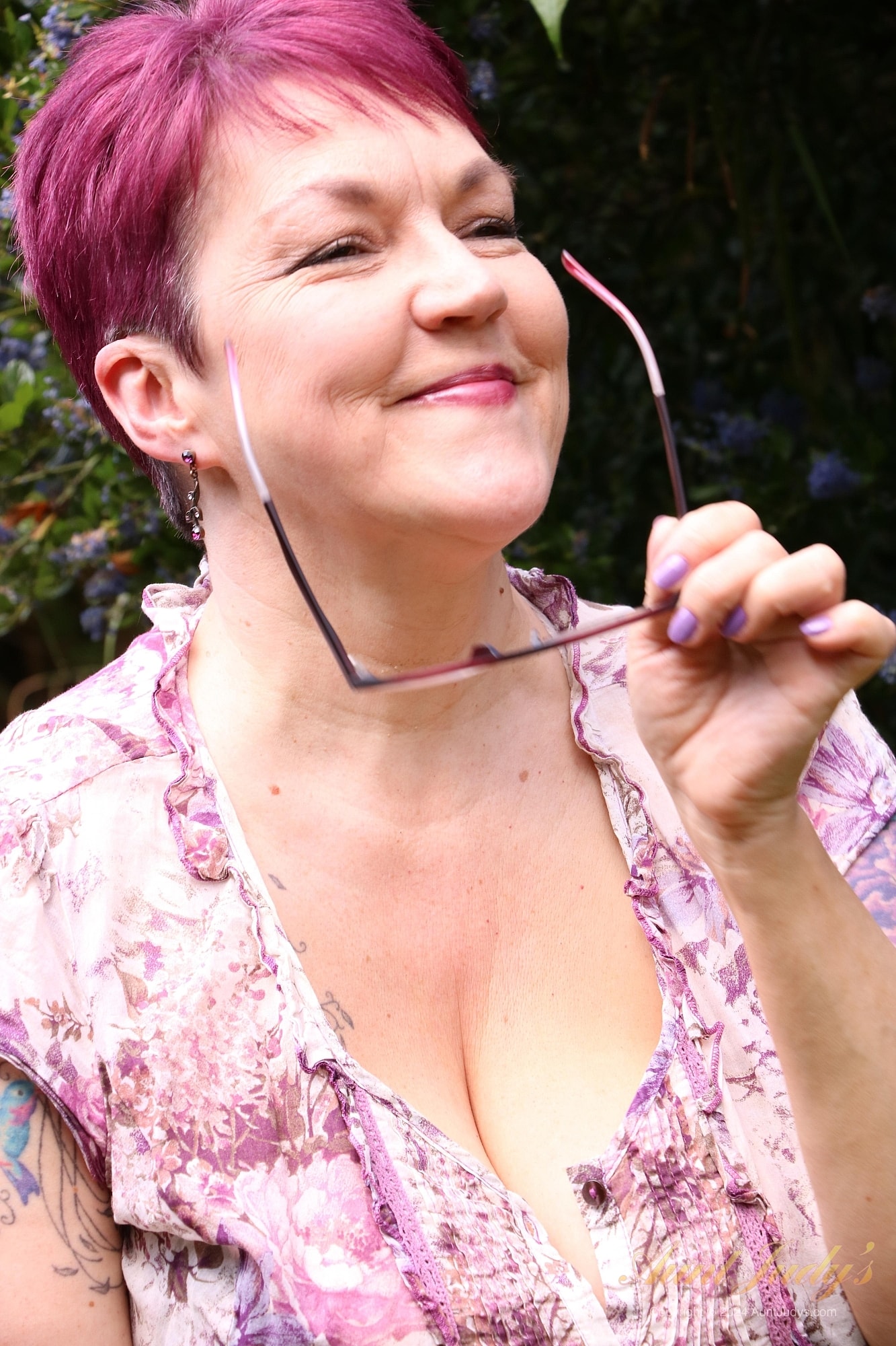 Short hair lady is going to pet her naked pussy outside