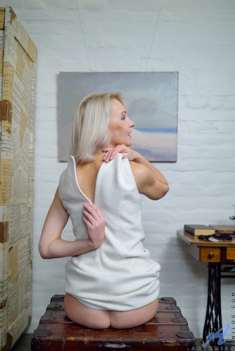 Blonde mature poses solo in the living room dressed in sexy outfit