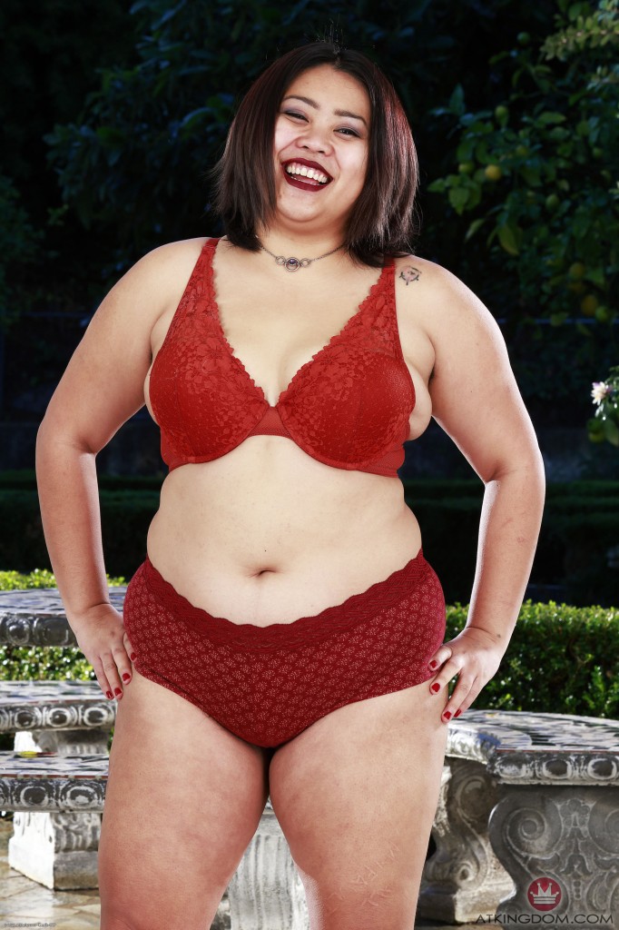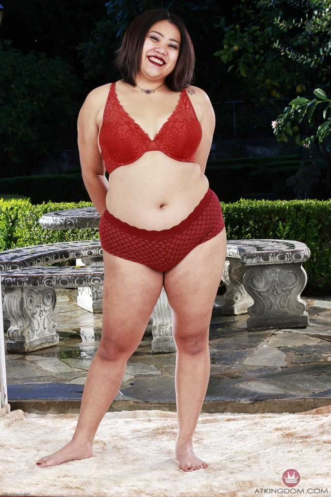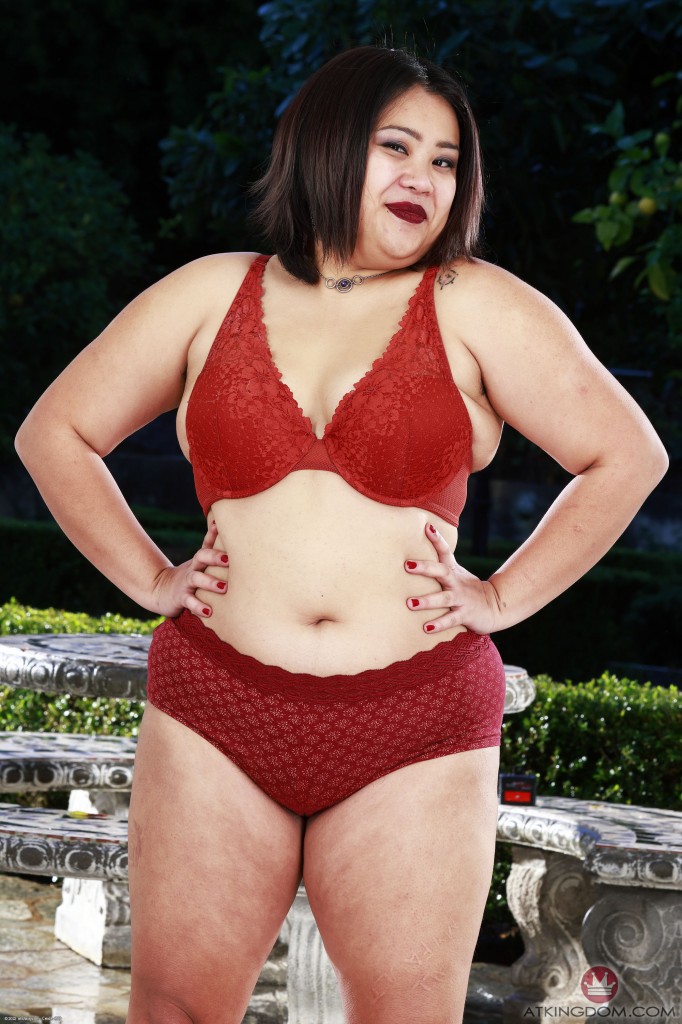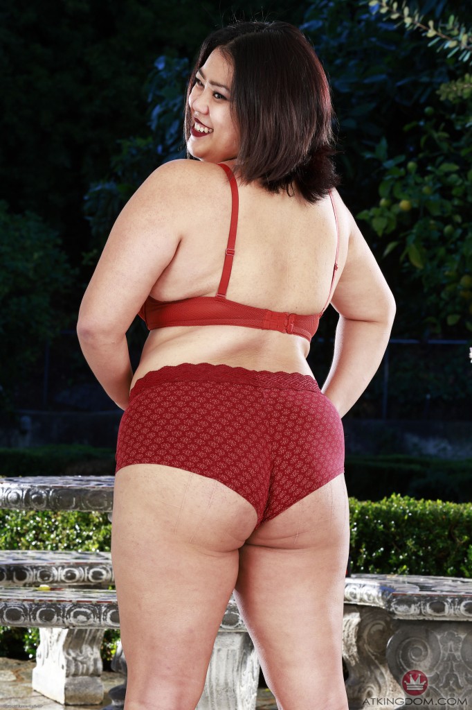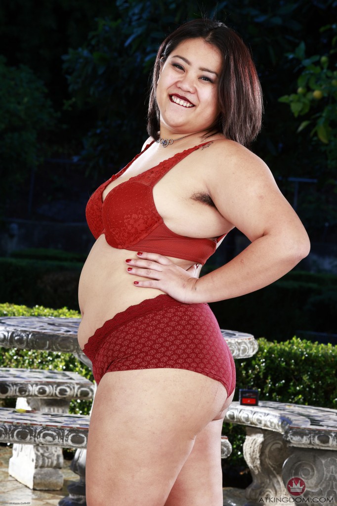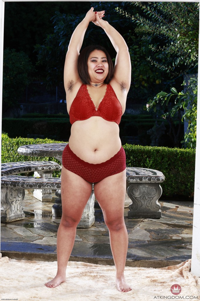 Chubby Asian mature shows her hairy pussy outdoors