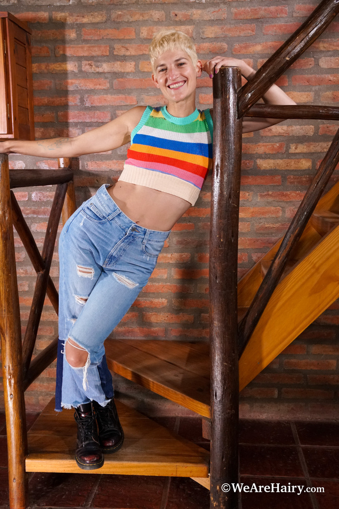Short-haired mature blonde spreads on couch showing her hairy pussy