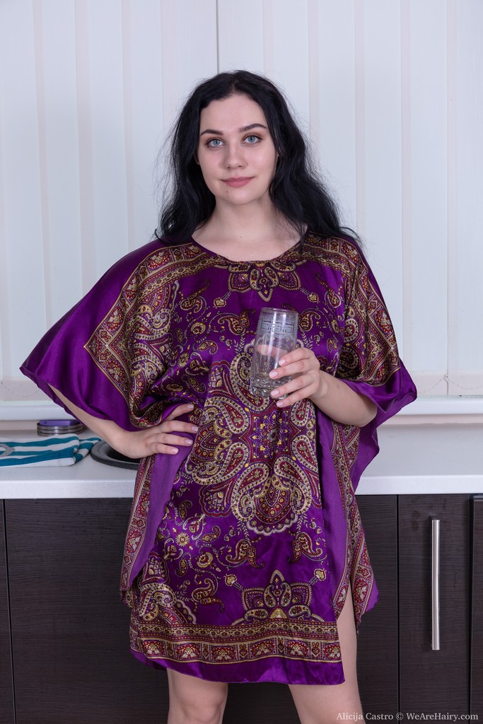 Lovely brunette mom displays hairy pussy in kitchen