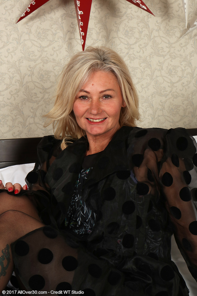 Mature blonde from Europe undresses leaving just black stockings