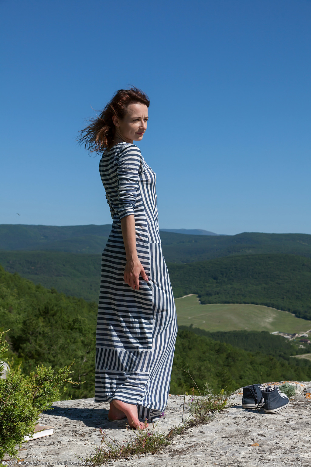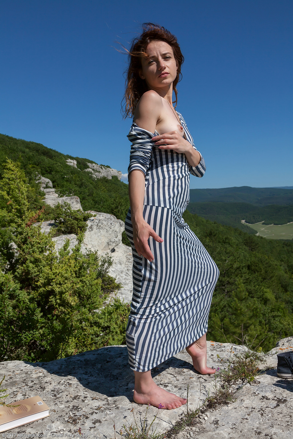 Petite hairy girl flashes muff after winning top of a rock