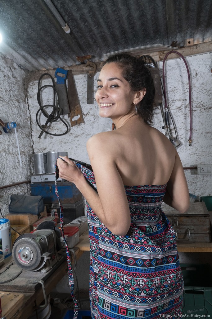Playful Latina comes to husband\'s garage and shows hairy vagina