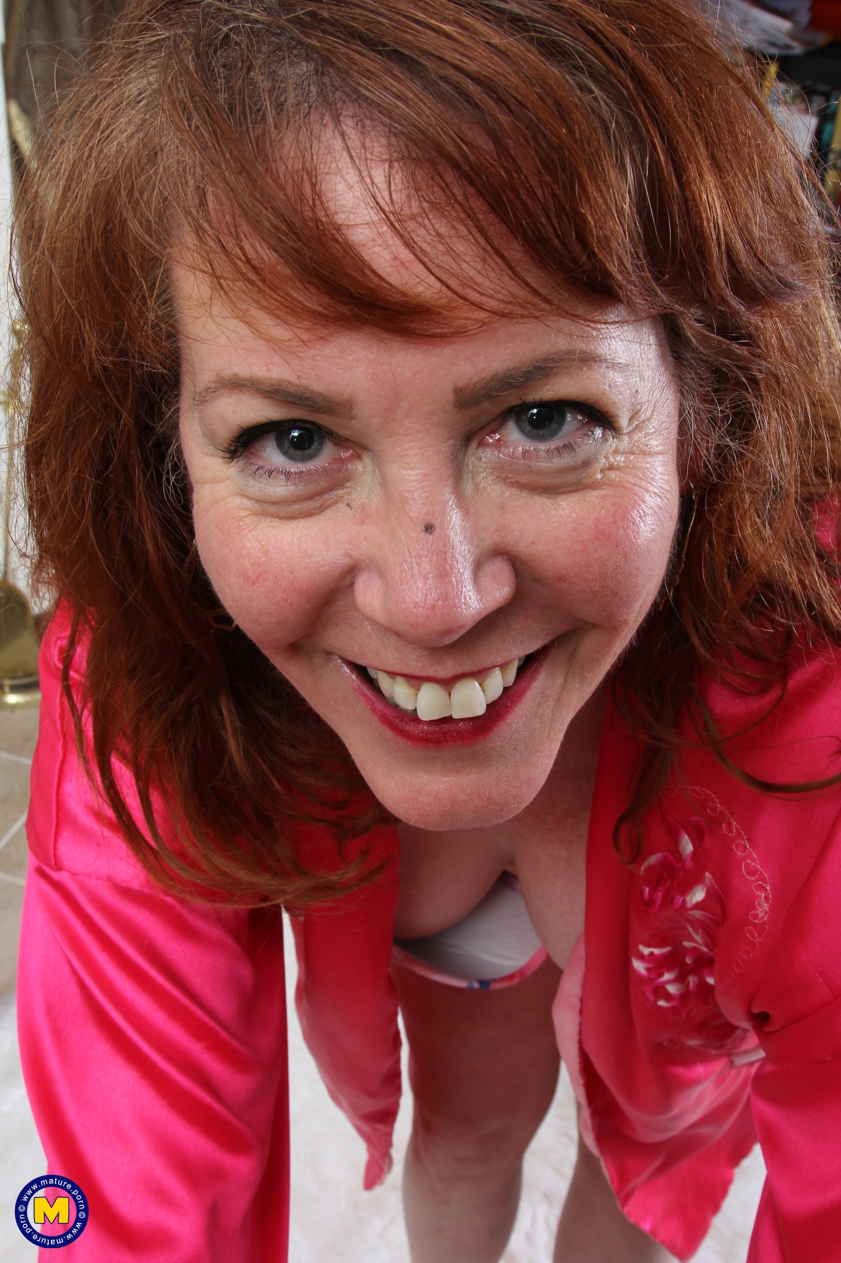 Curvy redhead gilf in heels plays with her tits and hairy pussy