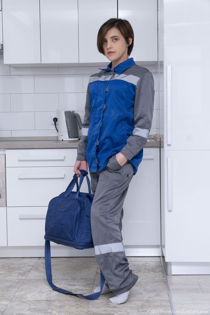 After work hottie takes off uniform to show her unshaved twat