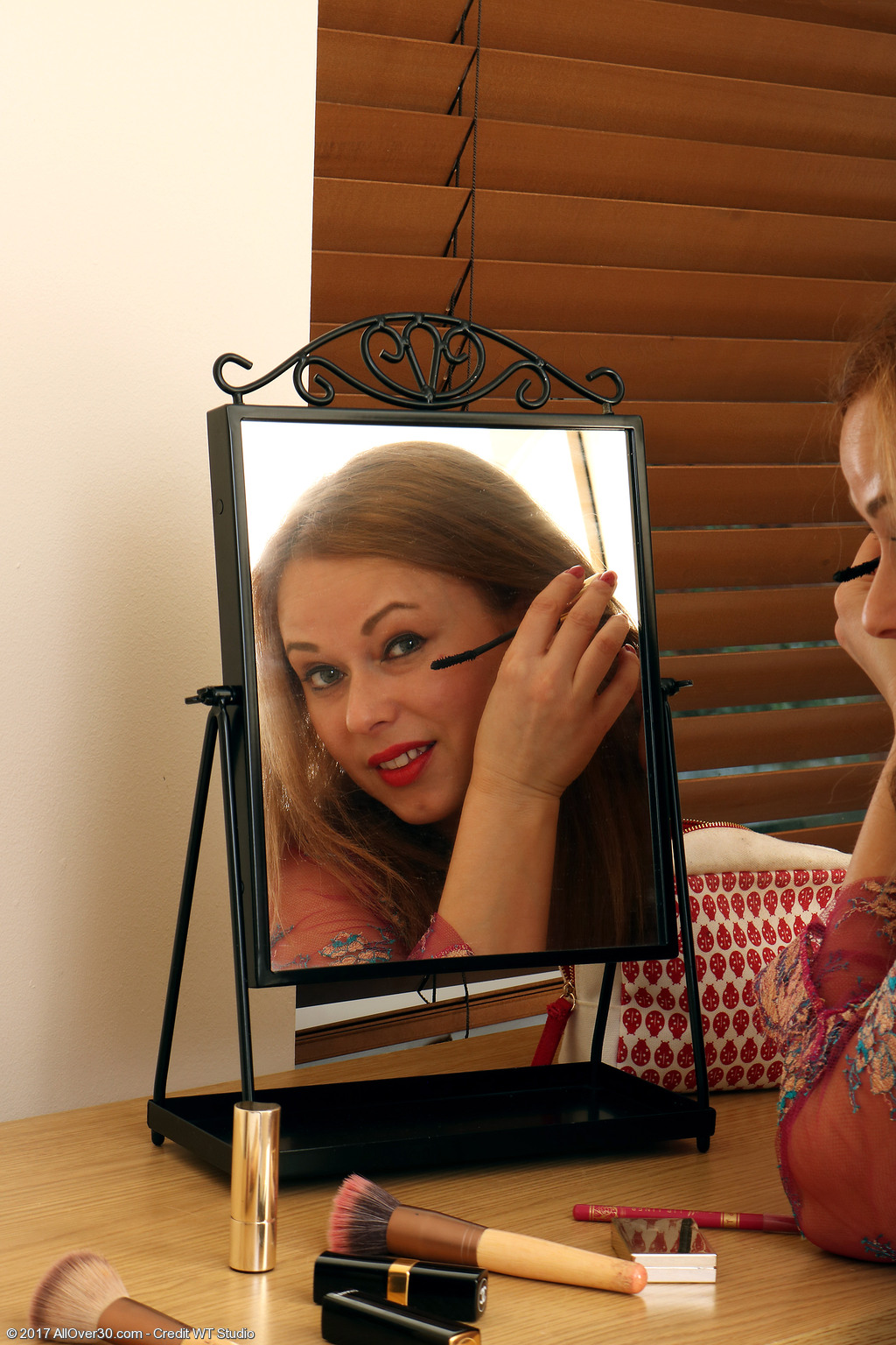 Bending over before touching her shaved cougar twat